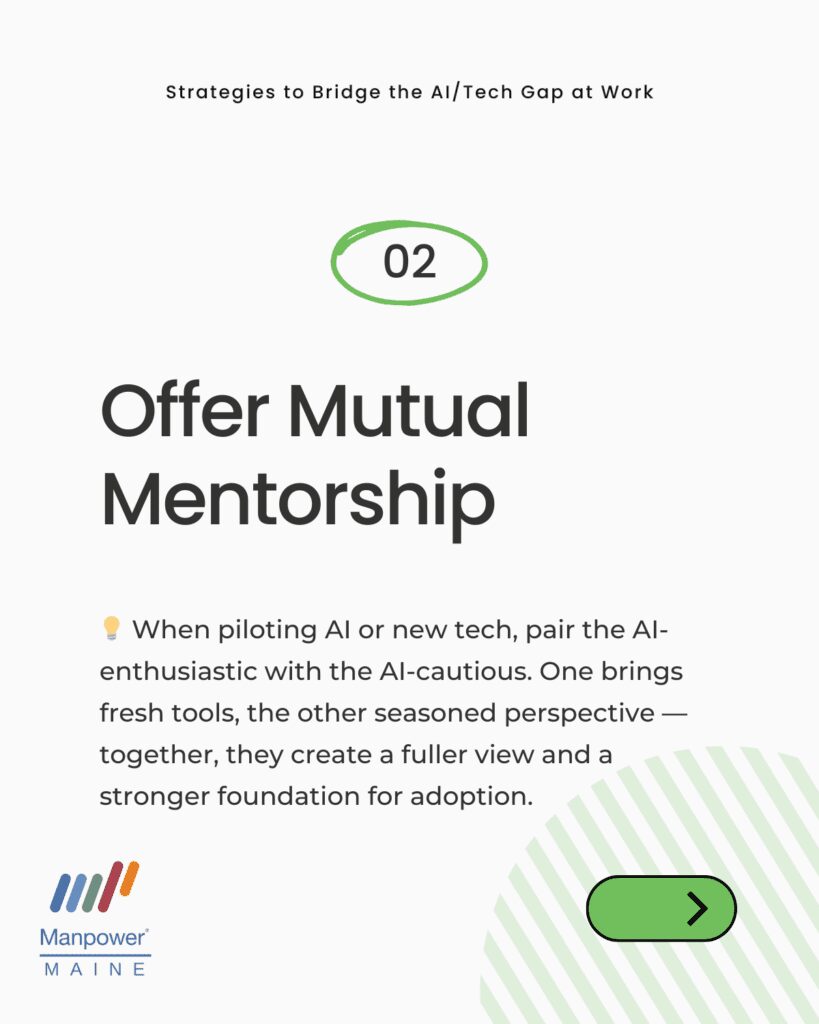 Pair AI enthusiasts with those who are more hesitant. Let the knowledge flow both ways — technical skills in one direction, and critical thinking, domain expertise, and caution in the others