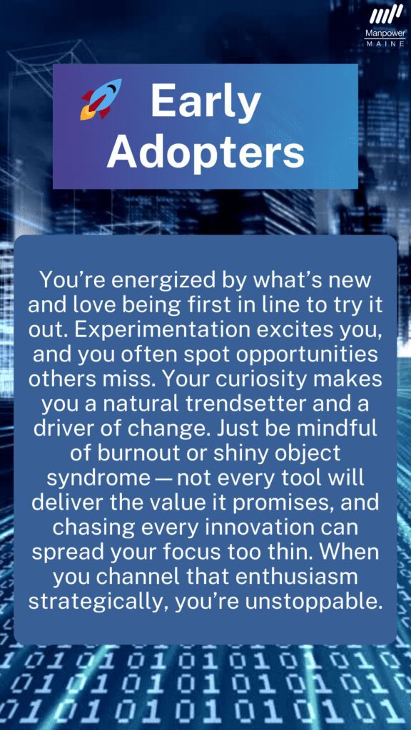 - The early adopters, who enthusiastically jump into the latest apps, tools, and AI platforms. They automate emails, generate content with AI, and are constantly looking for ways to do more with less.