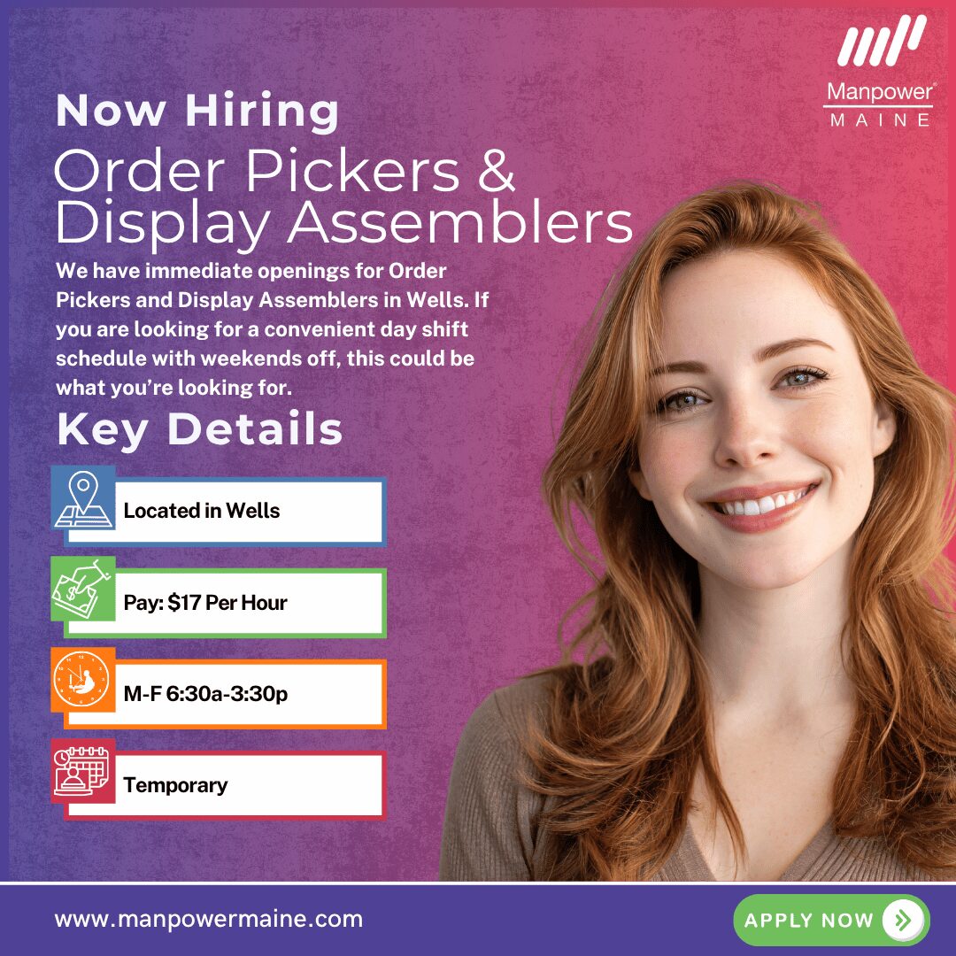 We have 3 immediate openings for Order Pickers and Display Assemblers for a special project in Wells. If you are looking for a convenient day shift schedule with weekends off, this could be what you’re looking for. These positions pay $17/hr and are temporary anticipated to last around a month.
