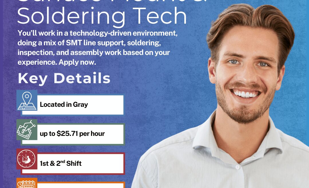 We’re hiring multiple SMT and Soldering Specialists to join our client’s electronics manufacturing team in Gray, Maine. If you enjoy hands‑on, detail‑focused work and want a job where you can build real technical skills, this could be a great fit. These roles pay up to $25.71 per hr and are long‑term, temporary‑to‑hire.